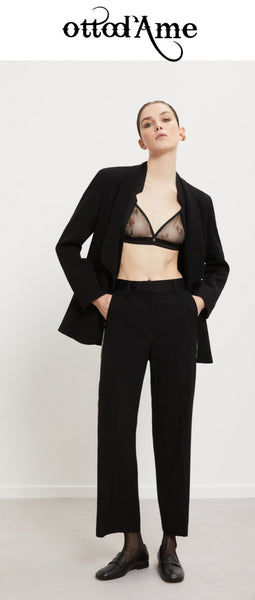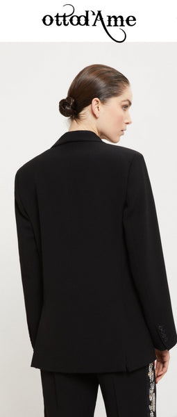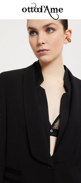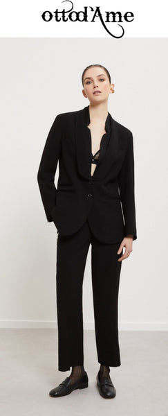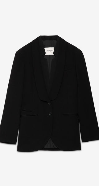 Giacca smoking fluida in satin misto lana, con doppio risvolto.