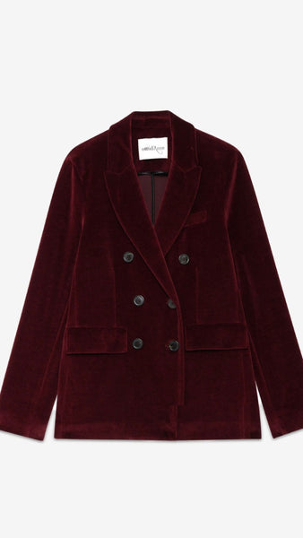 Giacca doppiopetto in velluto a costa larga, con effetto metallizzato.