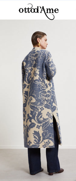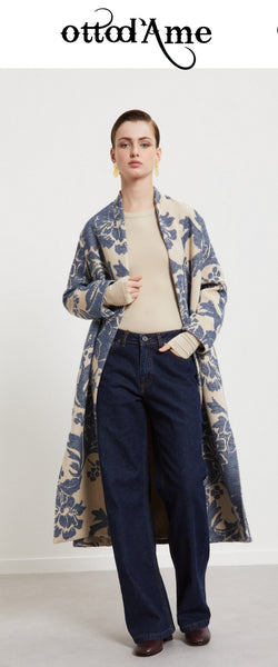 Cappotto sfoderato lungo stampato con collo sciallato e cintura.