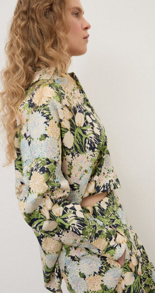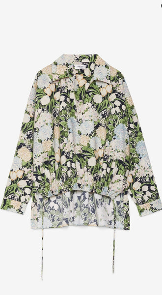 Camicia realizzata in 100% cotone con stampa floreale multicolor, dalla linea fluida e contemporanea. Il modello presenta una coulisse frontale che consente di regolare il fit e modellare il volume, accorciando il davanti e lasciando il retro più lungo per un gioco di proporzioni dinamico. Un capo versatile, pensato per valorizzare il movimento e offrire diverse possibilità di styling.