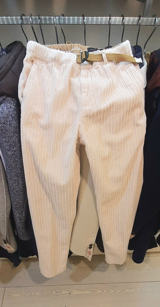 "Pantalone in velluto colore OFF WHITE Vita elasticizzata con coulisse Chiusura frontale con bottone e zip Due tasche laterali, una tasca a filetto e una con pattina sul retro Regular Fit Made in Italy.