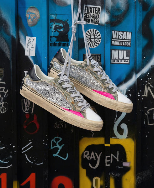 - Tomaia in glitter canna di fucile, dettagli in suede fuxia